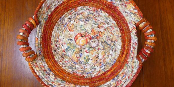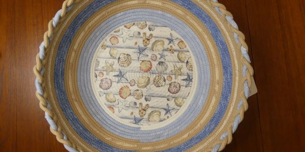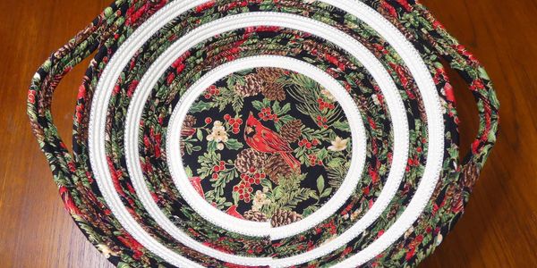 Bowls and baskets are made from clothesline rope with an embroidered center piece or decoupaged base, some wrapped with coordinating fabric and finished with seasonal decorations or a variety of beads, buttons and knots.